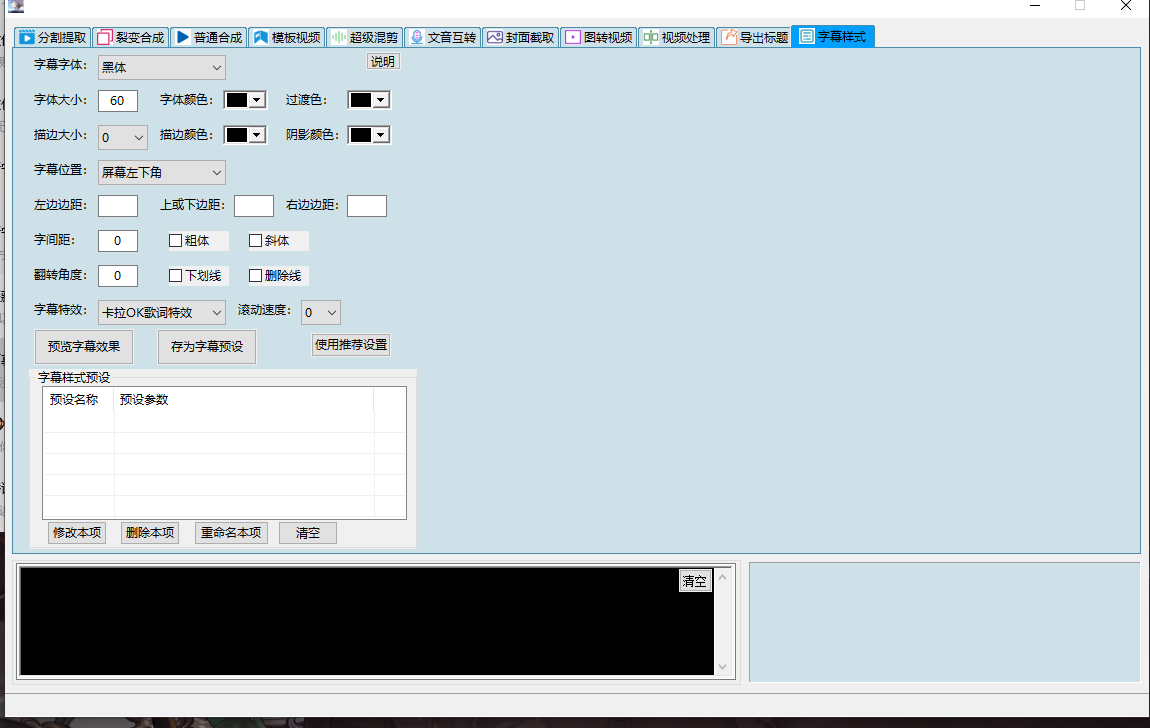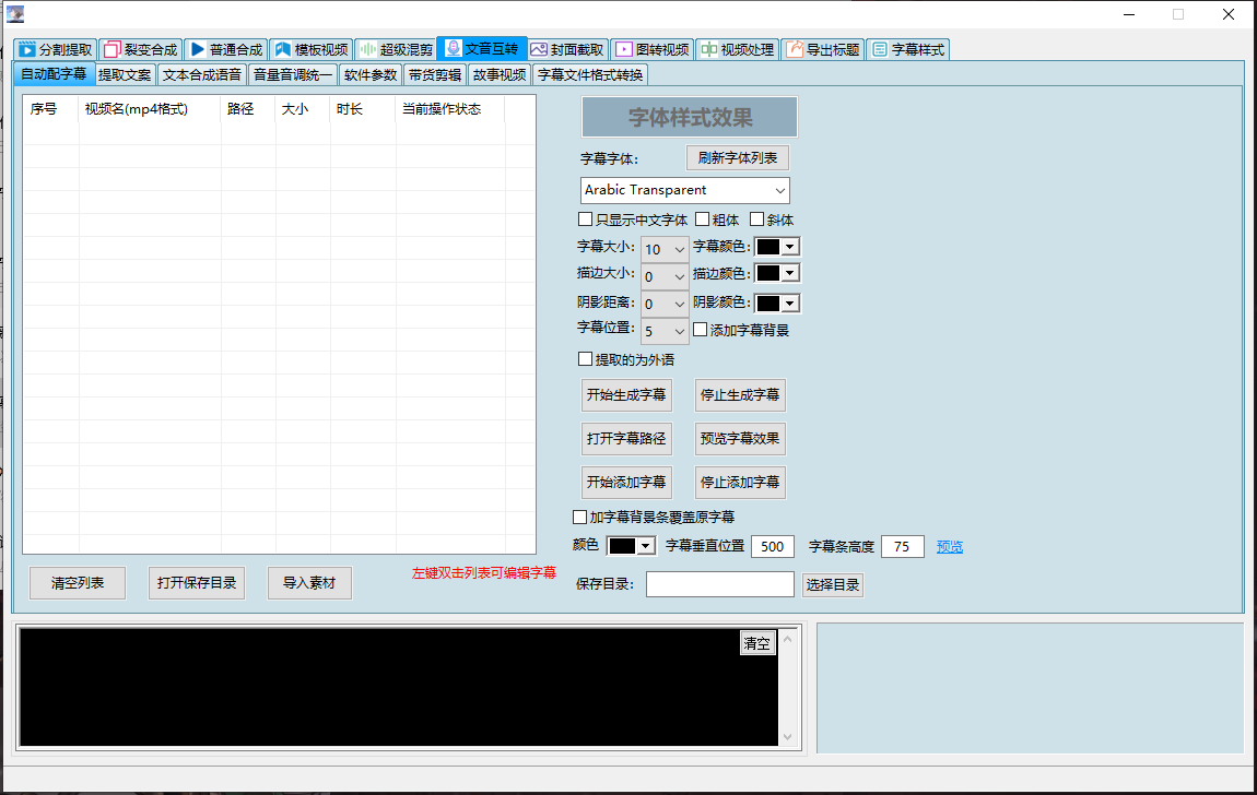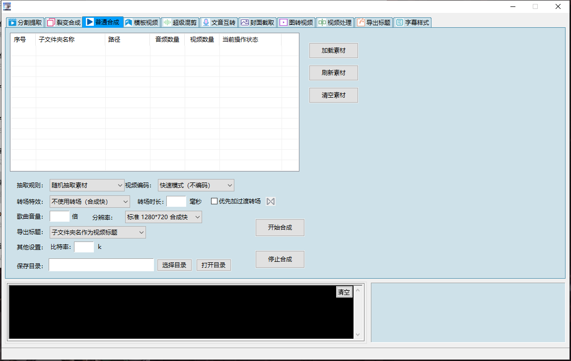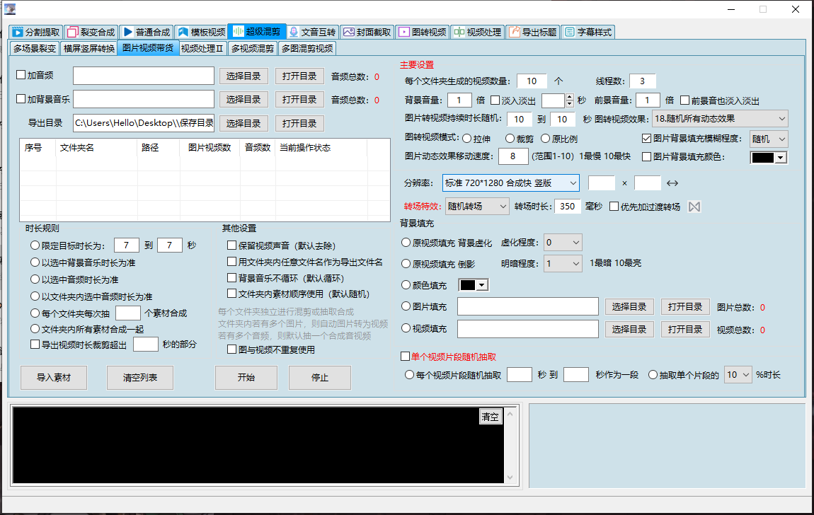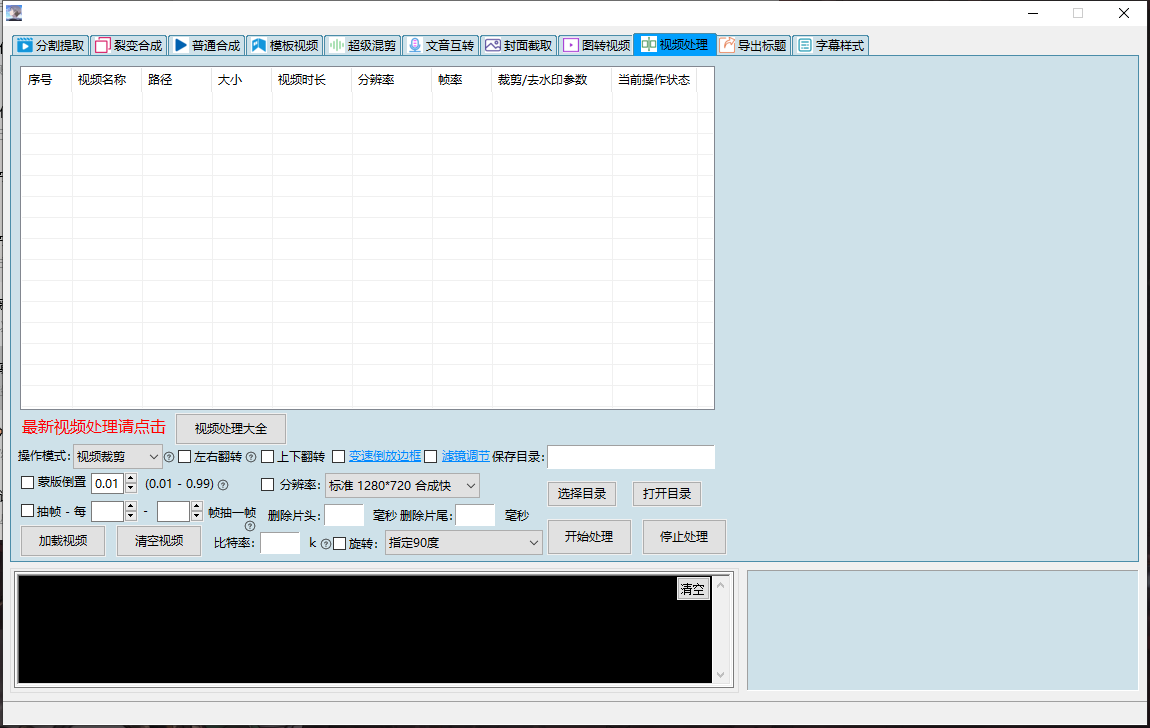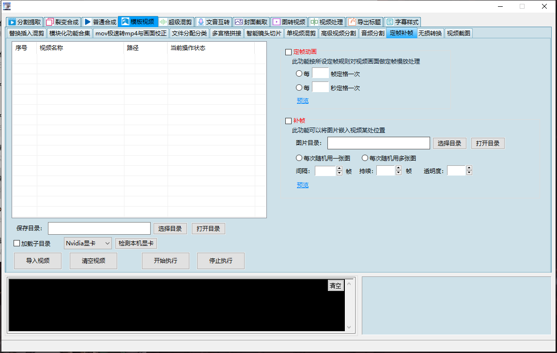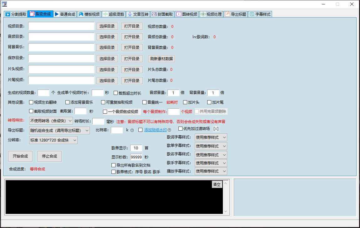 分割提取,裂变合成,普通合成,模板视频下书单视频,模板视频下替换插入混剪, 模板视频下模块化功能合集(探店带货系统、全自动卡点-混剪裂变视频、删音视频无声片段、抠人像换背景、故事影视解说、视频处理大全、 多场景顺序裂变、精细化顺序混剪、视频综合处理、音频变声处理),模板视频下mov极速转mp4与画面校正,模板视频下文件分配分类, 模板视频下多宫格拼接,模板视频下智能镜头切片,模板视频下单视频混剪,模板视频下高级视频分割,模板视频下音频分割, 模板视频下画中画神技,模板视频下定帧补帧,模板视频下无损转换,模板视频下视频截图,超级混剪(超级混剪下多场景裂变、 超级混剪下横屏竖屏转换、超级混剪下图片视频带货、超级混剪下视频处理、超级混剪下多视频混剪、超级混剪下多图混剪视频), 文音互转(文音互转下故事视频生产、文音互转下自动配字幕、文音互转下提取文案、文音互转下文本合成语音、文音互转下音量音调统一、 文音互转下参数配置、文音互转下原创带货、文音互转下故事视频、文音互转下字幕文件格式转换),封面截取,图转视频,视频处理, 导出标题,字幕样式。有数十种功能模块,可以满足上千种需求(如加字幕、加转场、加片头片尾、按帧截图、按时间、按镜头分割......)